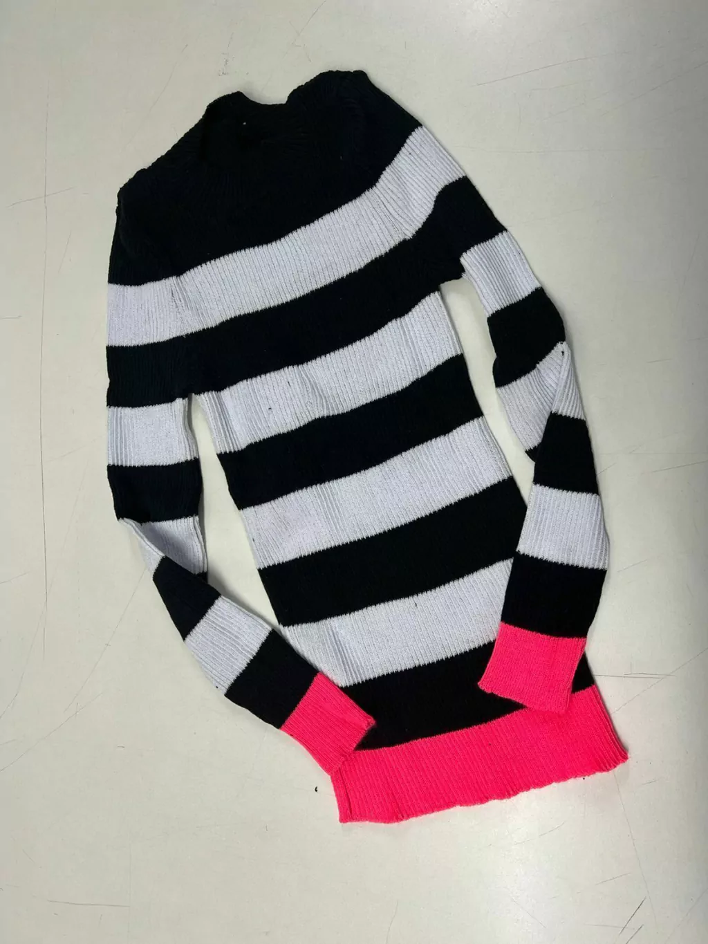 Blusa confeccionada em tricot, de manga longa, tecido macio e confortável. Possui listras em preto e branco com cores na manga. Sem bojo.