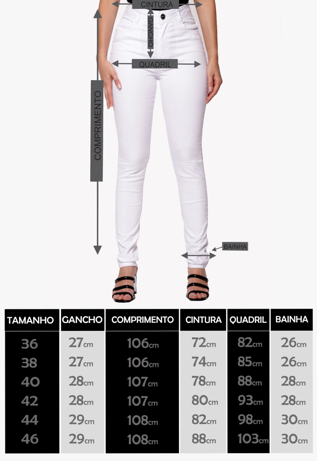 tamanho 44: cintura 82 cm; comprimento 108 cm; gancho 29 cm; quadril 98 cm; bainha 30 cm.
