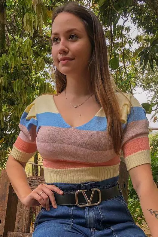 Cropped de tricot modal. Cropped confeccionado em tricot modal, com gola V e mangas curtas. Possui barras caneladas e caimento perfeito. Modelo ideal para os dias mais quentes.