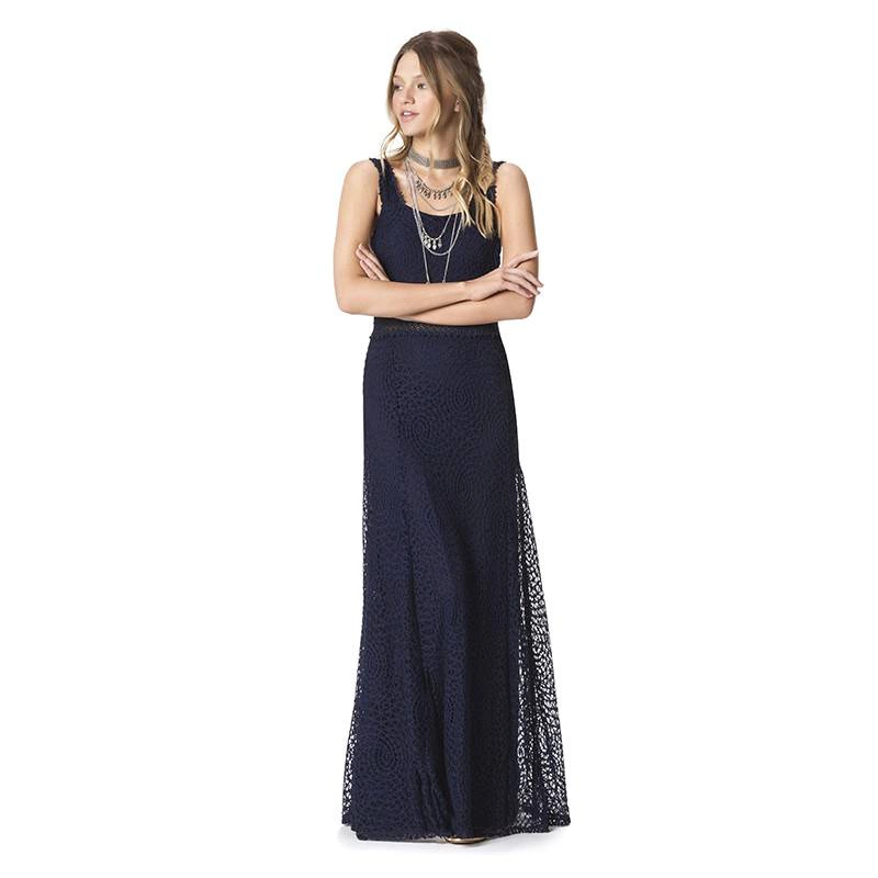 Vestido longo feminino. Confeccionado em renda, com forro em viscolycra. Sem bojo, é de alças, com fecho zíper lateral invisível, vazado abaixo do busto. Na cor azul, em um tom escuro. Confortável e charmoso.